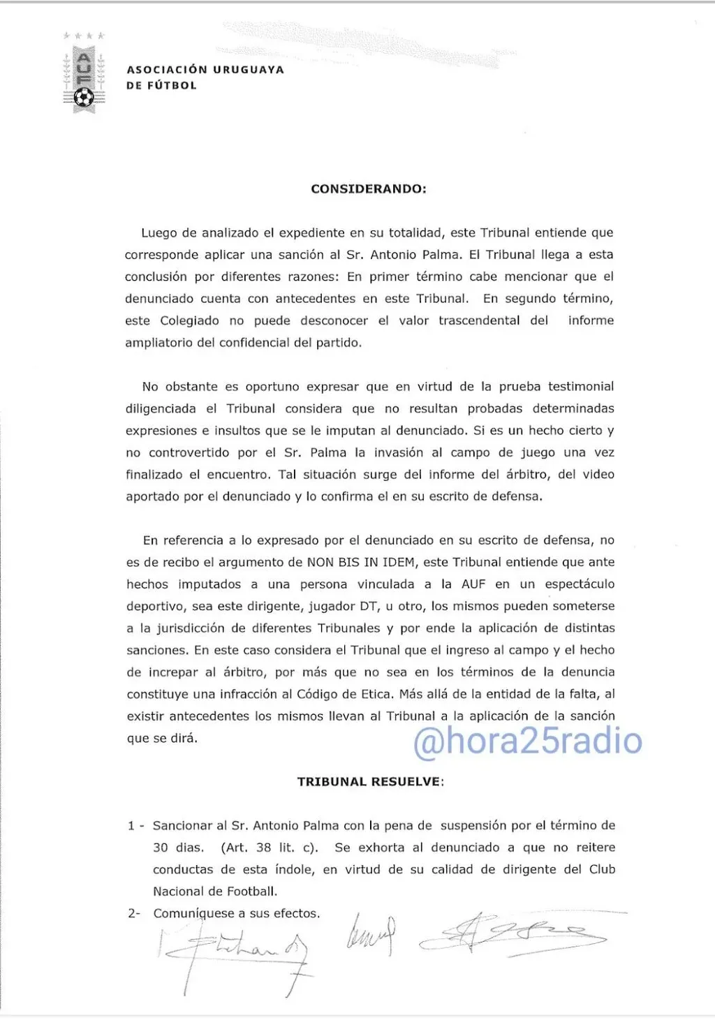 En ese sentido se resolvió una sanción de 30 días y se exhorta a Palma “a que no reitere conductas de esta índole, en virtud de su calidad de dirigente del Club Nacional de Football”.