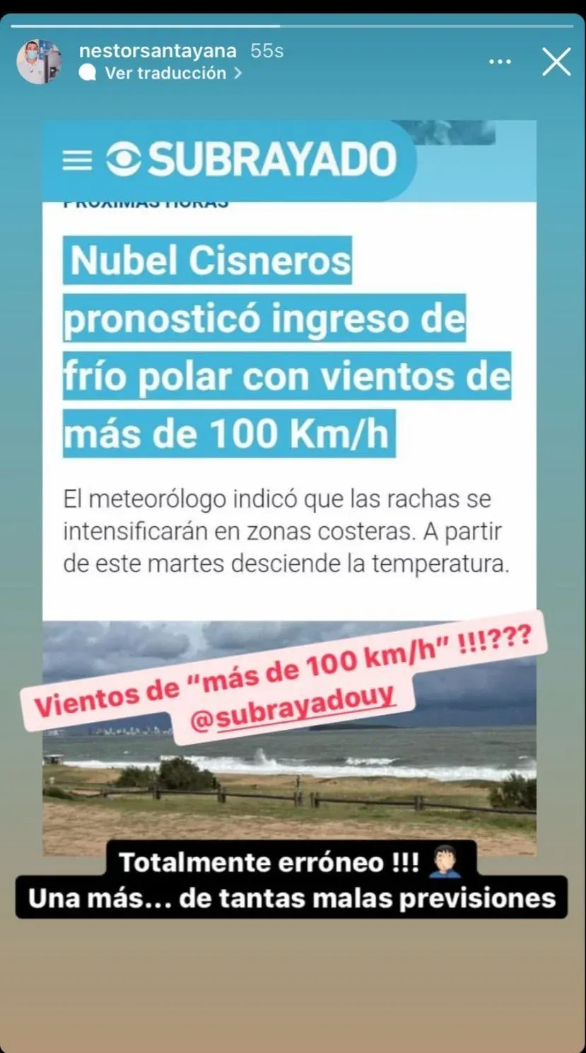 Santayana reaccionó este martes en sus cuentas de Instagram y Twitter. En la primera, puso una captura de pantalla de la noticia publicada por el noticiero en su sitio web, y cuestionó: "Vientos de 'más de 100km/h'!!!???". Afirmó: "Totalmente erróneo!!! Una más... de tantas malas previsiones".