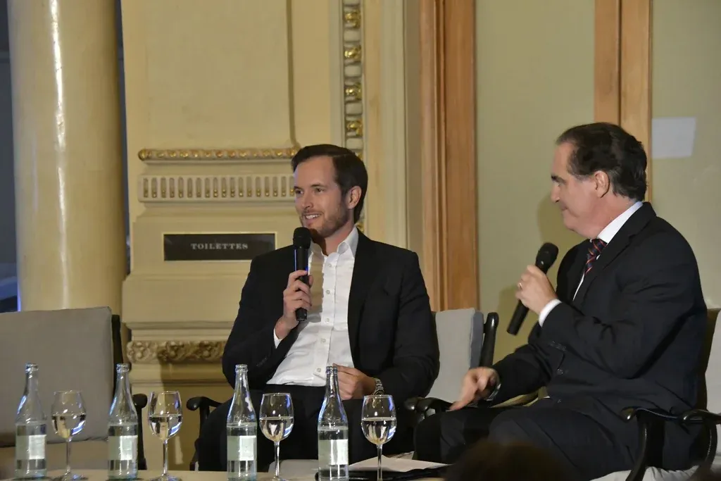 El CEO de HSBC Uruguay, Geoffrey Fichte, junto al periodista Nicolás Lussich.