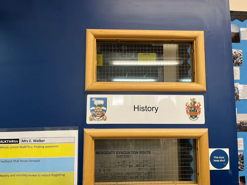 También se les enseña sobre los primeras exploraciones a la Antártida. En Ciencia estudian a (Charles) Darwin y sus viajes. En el grado 9 (con estudiantes de 13 y 14 años) realizan un gran proyecto donde se repiten algunos de los contenidos que ya habían aprendido sobre la historia de la isla y luego aprenden sobre la guerra. En ese momento ya son grandes y eso los alienta a pensar sobre... Una de las cosas que tratamos de enseñar en historia es que puedan pensar en forma crítica. Entonces analizan artículos, o cualquier otra información, y piensan '¿qué estaba pensando esta persona cuando lo escribió?', también analizan si existe sesgo. Son habilidades que uno intenta fomentar en historia.