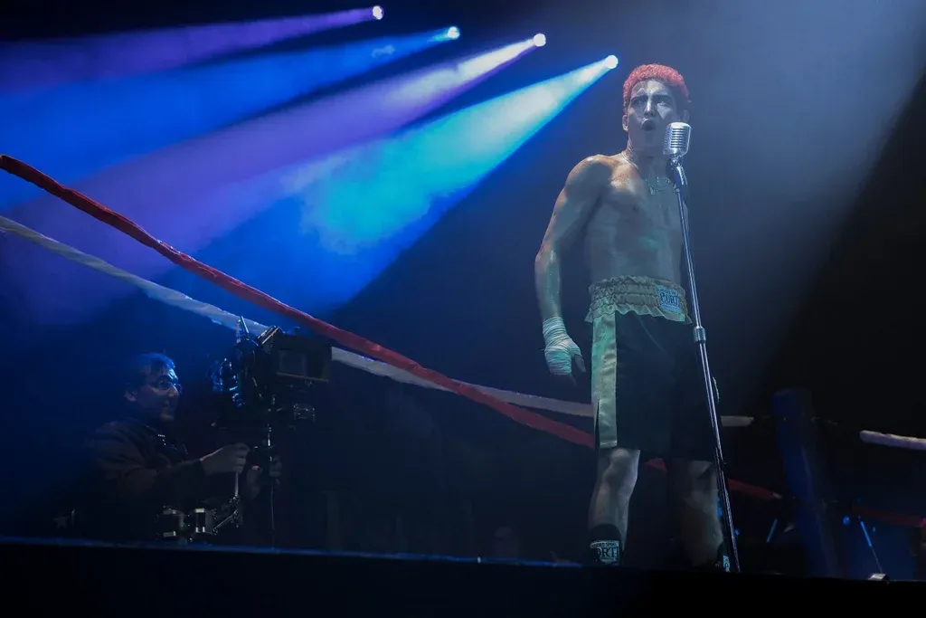 La escena fue un homenaje a Toro Salvaje de Martin Scorsese, una película que amo. Y también remite un poco a Gatica, de Leonardo Favio. De Toro Salvaje siempre me quedó grabada la imagen del comienzo, con Jake LaMotta saltando en el ring en cámara lenta y en blanco y negro. Me parece hermosa. Quería reproducir eso, y me parecía que tenía que ver mucho con Rodrigo. Cuando empezamos a buscar qué historia contar, nos encontramos con un elemento fascinante desde el simbolismo. La imagen del cartel de los shows del Luna Park, que el propio Rodrigo diseñó, lo mostraban enfrentado a otro Rodrigo, como dos boxeadores. Cuando lo vimos entendimos que ese era el concepto de la película. Era el conflicto interno del personaje. Rodrigo contra Rodrigo, contra sus demonios.