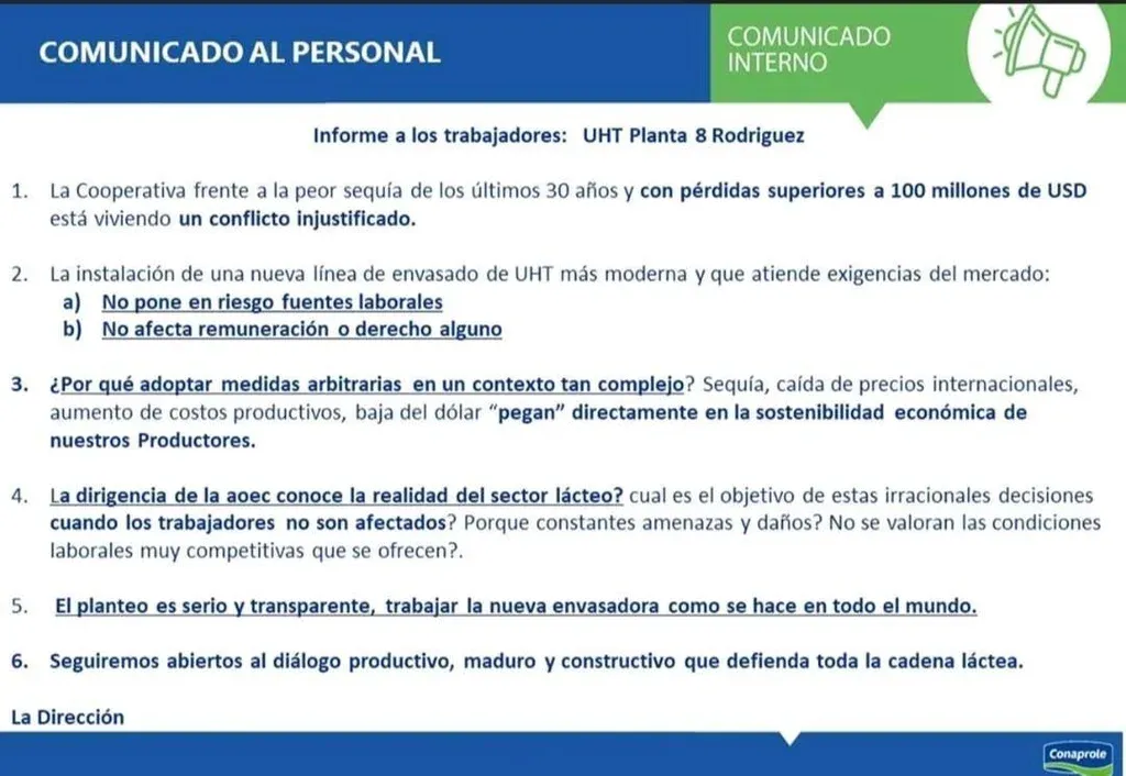 Conaprole, mediante un comunicado dirigido a los productores remitentes que integran la cooperativa y a la opinión pública, defendió el valor de las inversiones realizadas en la planta de producción de leches ultrapasteurizadas (UHT) en Rodríguez, San José, a la vez que calificó al conflicto sindical emprendido por la Asociación de Obreros y Empleados de Conaprole (AOEC) como "injusto" e "inexplicable".