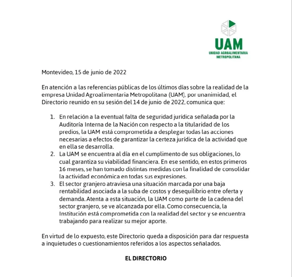 El comunicado también alude a la señalada Auditoría Interna de la Nación, que divulgó entre otros factores la existencia de falta de seguridad jurídica en la gestión de la UAM, sobre lo cual se afirmó: "La UAM está comprometida a desplegar todas las acciones necesarias a efectos de garantizar la seguridad jurídica de la actividad que en ella se desarrolla".
