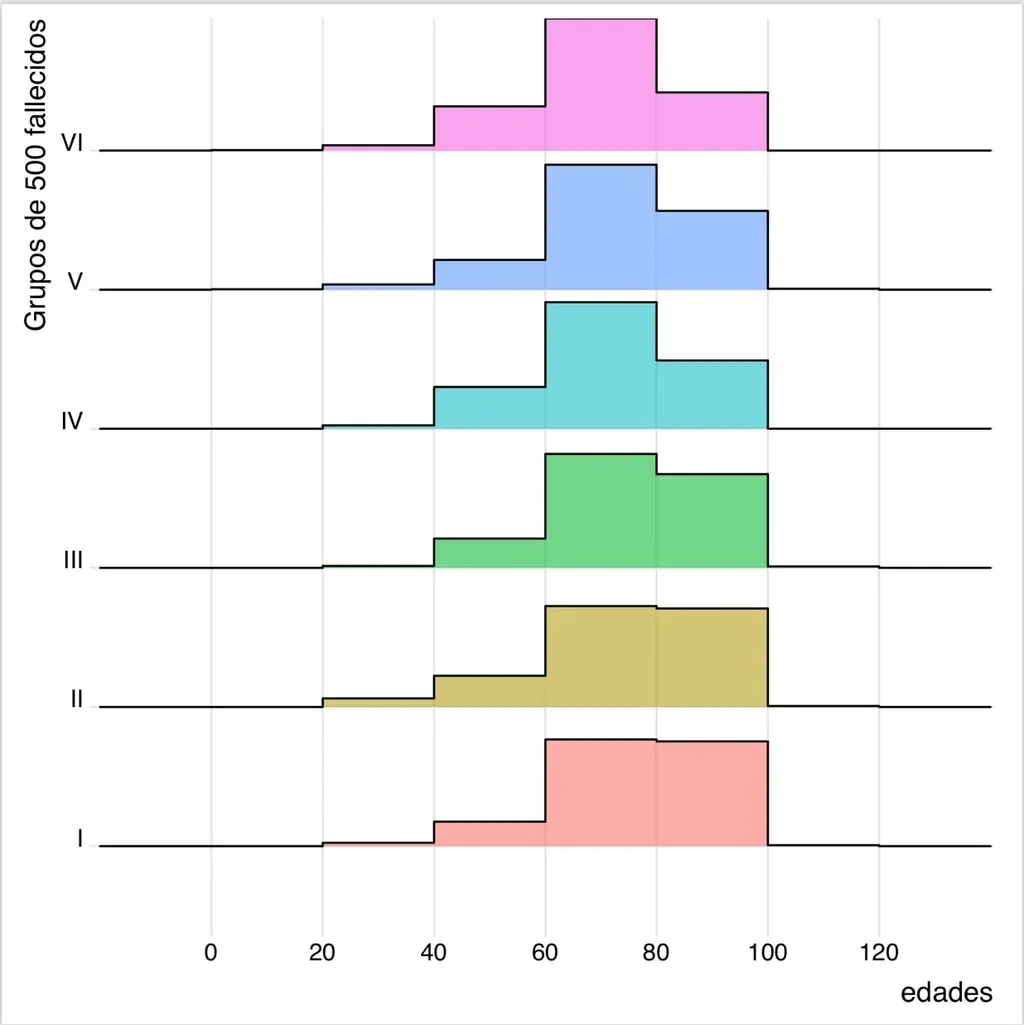 Entre los primeros 500 muertos por este virus en Uruguay (el grupo que aparece más abajo) hay casi la misma cantidad de 60 a 80 años que de entre 80 a 100 años. Sin embargo, en el grupo VI, que tiene los últimos 500 fallecidos, predomina el rango 60 a 80 años.