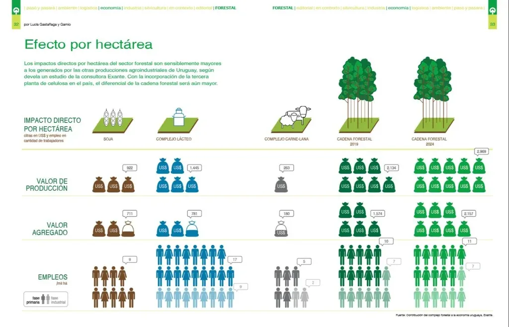 Ese mismo año, el valor agregado de la forestación tuvo un impacto directo de US$ 1.574 por hectárea, mientras que el de la producción sojera fue de US$ 711, el de la lechería US$ 781 y el del complejo carne y lana US$ 180.