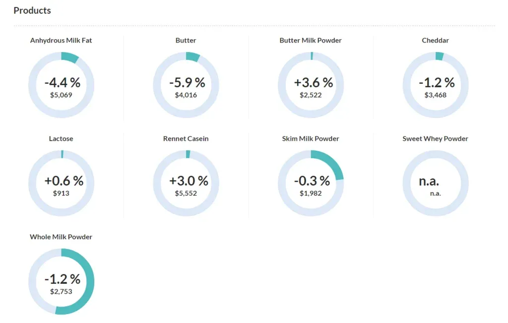 La grasa butírica anhidra (AMF) tuvo una caída de 4,4% hasta US$ 5.069 por tonelada.