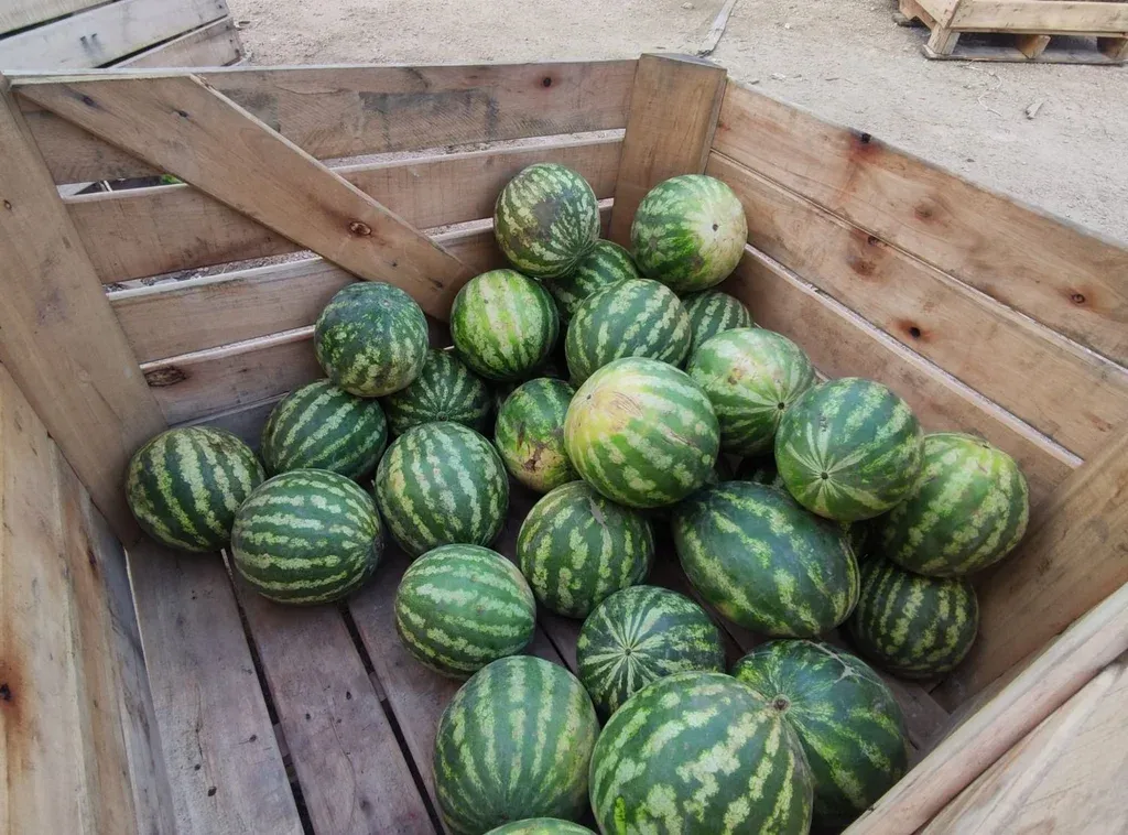 La sandía de esta zafra tiene una buena calidad y en enero está en el momento más óptimo de su dulzura. Para que esté en buenas condiciones y el clima no la afecte se toman precauciones y una de ellas es pintar cada fruta con cal para que el sol no las queme.