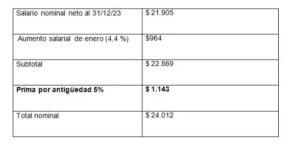 Al 31 de diciembre de 2023 la trabajadora percibía un salario nominal mensual de $ 23.000 incluida la prima por antigüedad.