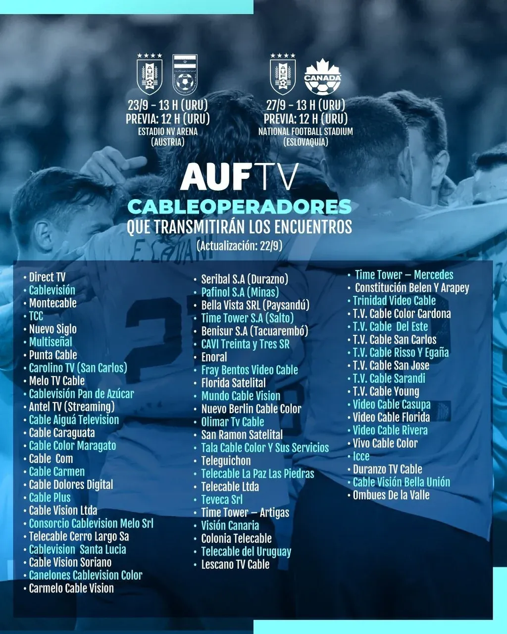 Desde la AUF informaron que suscribieron acuerdos y se podrá ver el partido de Uruguay en Cablevision, DirecTV, Montecable, TCC, Nuevo Siglo, TV Cable del Este (Punta del Este), Telecable Uruguay (San Carlos), Cablevision Pan de Azúcar, Visión Canaria (La Paz/Las Piedras), Colonia Telecable, Melo TV Cable, Seribal (Durazno), Pafinol (Minas), Bella Vista (Paysandú), Time Tower (Salto), Benisur (Tacuarembó), Cavi Treinta y Tres y Lascano TV Cable, Enoral, Fray Bentos Video Cable, Florida Satelital, Mundo Cable Vision, Nuevo Berlín Cable Color, Olimar Tv Cable, San Ramón Satelital, Tala Cable Color y sus servicios, Teleguichón, Telecable La Paz Las Piedras, Telecable Ltda., Teveca Srl, Time Tomer (Artigas), Visión Canaria, Colonia Telecable, Telecable del Uruguay, Lescano TV Cable, Time Tower (Mercedes), Constitución Belén y Arapey, Trinidad Video Cable, TV Cable Color Cardona, TV Cable del Este, TV Cable San Carlos, TV Cable Risso y Egaña, TV Cable San José, TV Cable Sarandí, TV Cable Young, Video Cable Casupá, Video Cable Florida, Video Cable Rivera, Vivo Cable Color, Icce, Durazno TV Cable, Cable Visión Bella Unión y Ombues de la Valle.