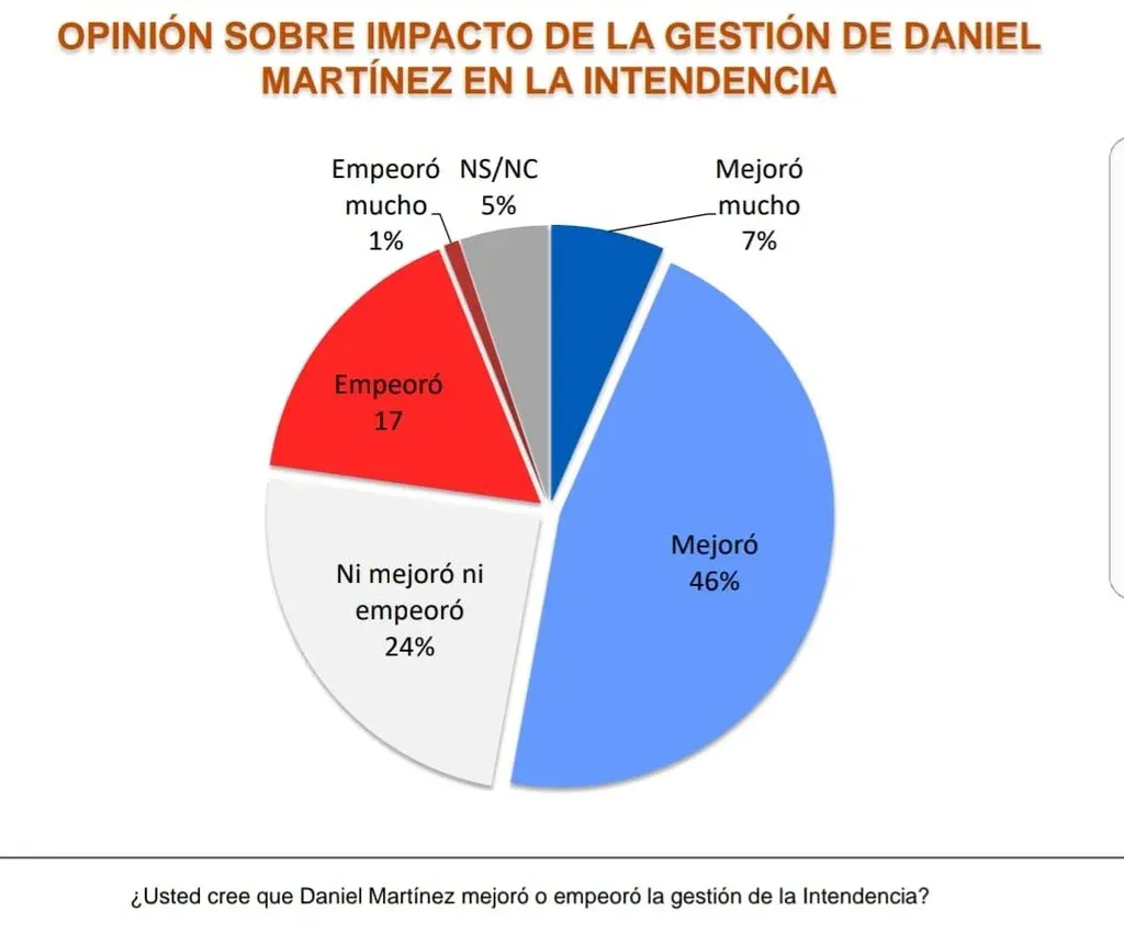El total de la encuesta sobre la gestión de Martínez en la Intendencia se completa con 24% que opinó que ni mejoró ni empeoró, 17% que respondió que empeoró y 1% que dijo que empeoró mucho. El 5% restante prefirió no contestar.