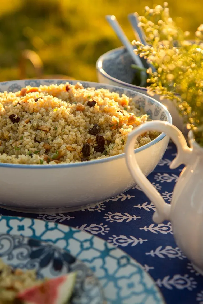 Una de ellas es a base de quinoa, a la que le agregamos pasas de uva, maní y perejil. Me encanta la combinación porque ninguno de sus ingredientes sobra. Cada uno aporta su personalidad y convierte a esta ensalada en un bocado salado, dulce, crocante y fresco. Todo a la vez.