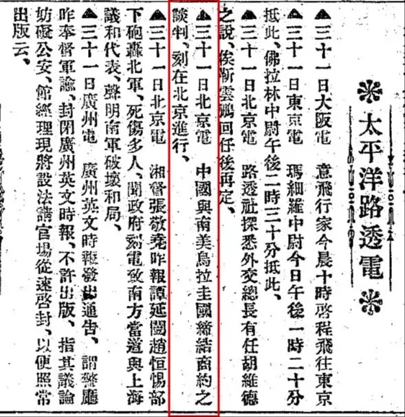 Gentileza de Líber Di Paulo y Georgina Pagola Recorte del diario "Shenbao"《申报》del 1 de junio de 1920. Dice que el 31 de mayo "se llevaron a cabo en Beijing las negociaciones para la conclusión de un acuerdo comercial entre China y Uruguay en América del Sur".