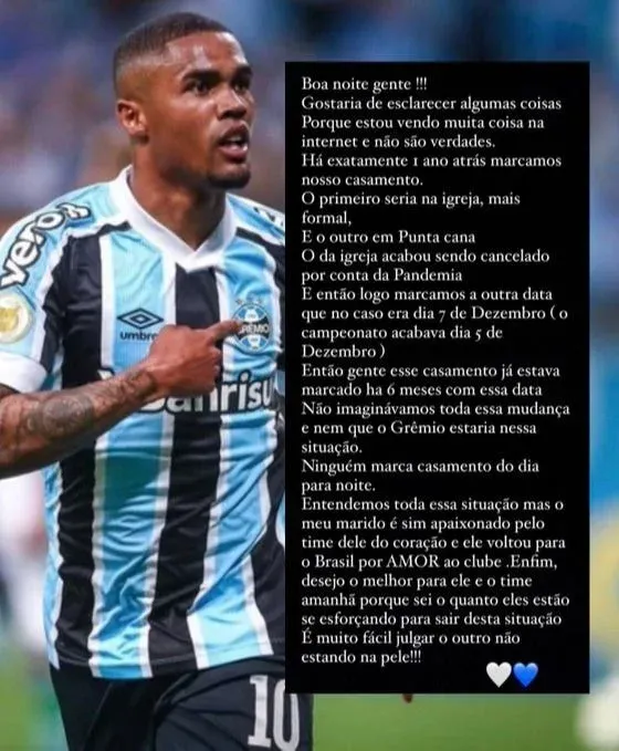 La pareja de Douglas Costa hizo los descargos en las redes sociales.