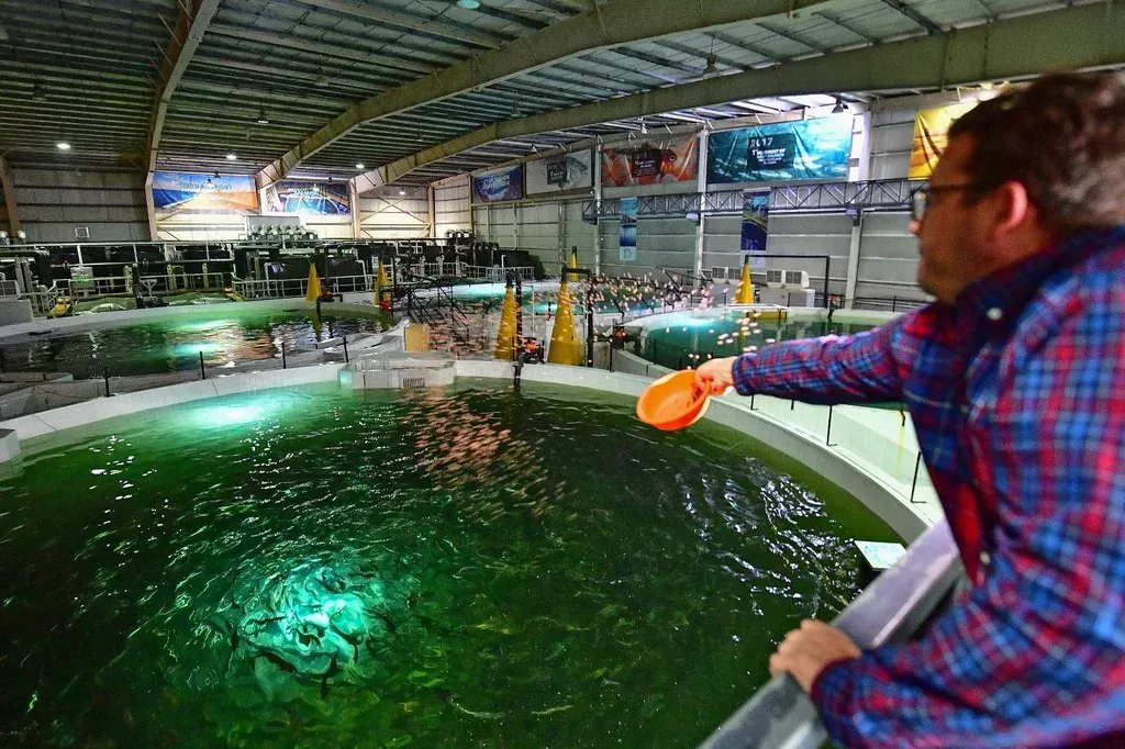 En las instalaciones, el agua y las temperaturas fluctúan para crear las condiciones que necesitan los salmones para crecer en cuatro tanques gigantescos en pleno desierto.