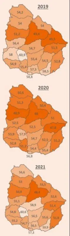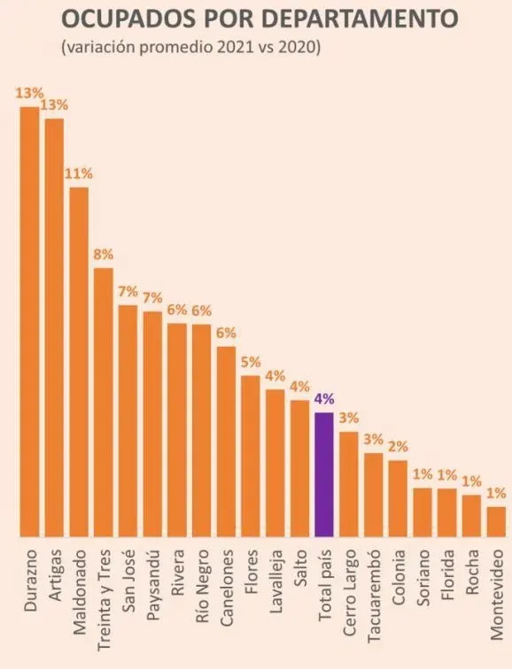 En cuanto a la distribución territorial, los departamentos de Durazno, Artigas y Maldonado presentaron el mejor desempeño con creación de puestos de trabajo superiores al 10% respecto a 2020. En sentido contrario, Soriano, Florida, Rocha, y Montevideo fueron los departamentos menos dinámicos.