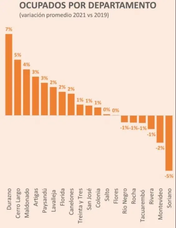 A su vez, el informe compara los números de empleo de 2021 y 2019 y vuelve a señalar que destacan los casos de Durazno y Maldonado, y los malos desempeños de Soriano y Montevideo (este con una pérdida neta de 16 mil empleos).
