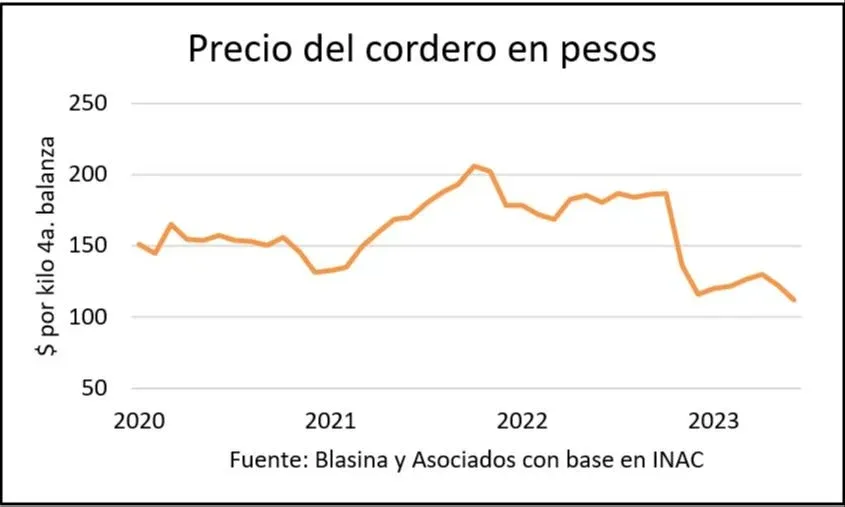 Los ovinos se han desvalorizado más aún que los vacunos. El cordero en pesos está 26% por debajo de enero de 2020 y 15% abajo respecto a 2021, con una caída de 38% en los últimos 12 meses.
