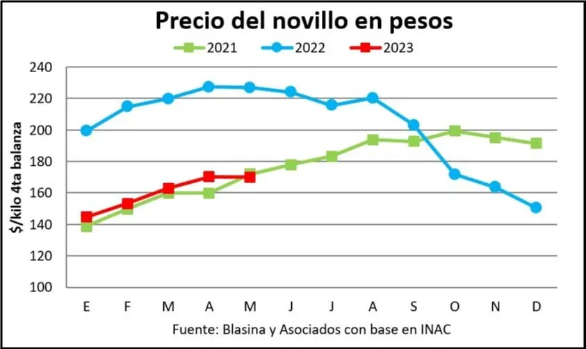 A su vez, la relación entre los kilos de novillo gordo para pagar el salario mensual de un peón especializado, que entre 2021 y 2022 había bajado 20%, volvió a saltar un 28% en los últimos 12 meses y hoy está en 345 kilos.