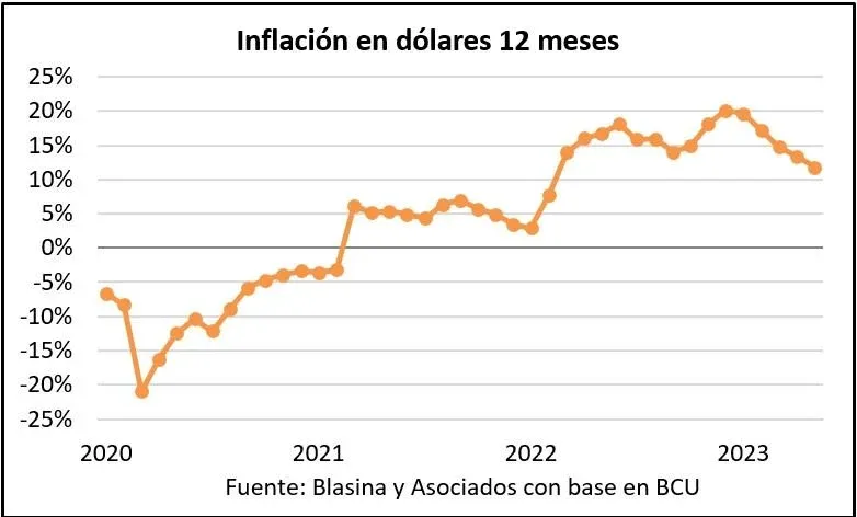 La inflación en dólares ha sido de dos dígitos en los últimos 15 meses (marzo 2022), con un pico de 20,1% en diciembre de 2022 y en mayo se situó en 11,75%.