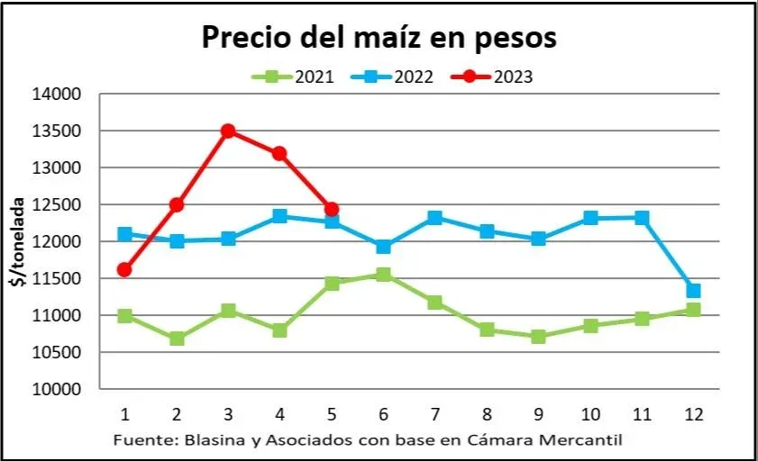 El maíz en pesos cruzó los $ 9 mil por tonelada en noviembre de 2020 y en diciembre ya había superado los $ 10 mil. En 2021 se mantuvo todo el año entre $ 11 mil y $ 11.500, en 2022 en el eje de $ 12 mil y tocó un máximo de $ 13.500 en marzo de 2023. Recién en las últimas semanas empezó a ajustar, pero la escasez en Argentina sostiene los precios.