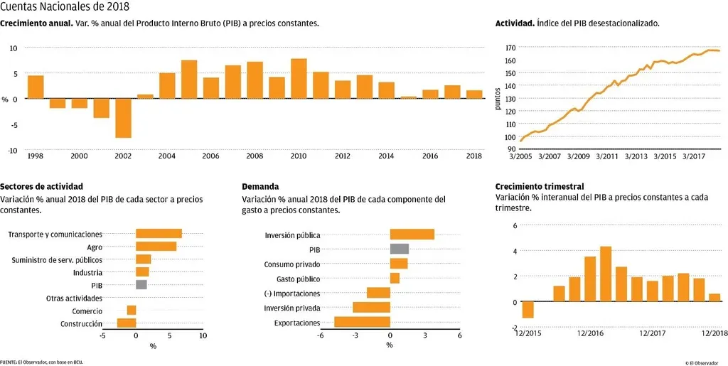 La economía uruguaya completó 16 años consecutivos de crecimiento en 2018. Sin embargo, el último ejercicio estuvo marcado por la desaceleración y, sobre todo, por un virtual estancamiento de la actividad a partir del segundo trimestre del año, con algunos de los principales sectores con una caída de su producción en el período y con la inversión en su menor nivel desde 2004.