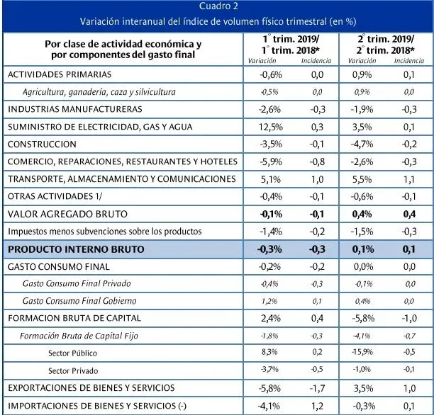 Por otro lado, el consumo privado se mantuvo estancado (-0,1%) respecto a igual trimestre del año pasado, mientras que el gasto del gobierno se expandió 0,4%. En tanto, la inversión volvió a mostrar números rojos con una caída de 5,8% en la comparación interanual en abril-junio, con un descenso del sector público del 15,9%, pero más moderado el sector privado (-1%).