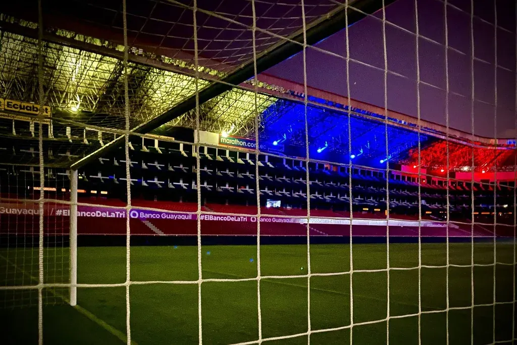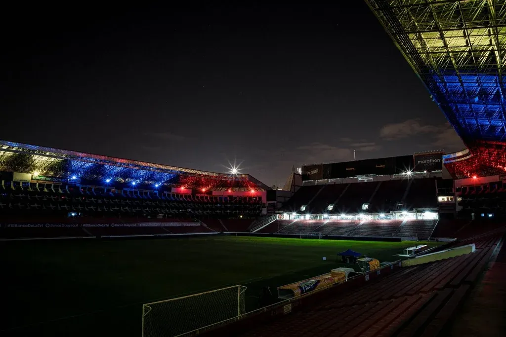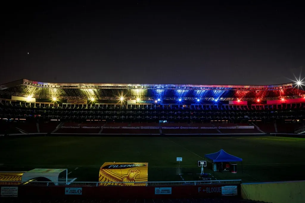 La nueva cancha de la selección ecuatoriana es el escenario de Liga Deportiva Universitaria de Quito, la “Casa Blanca”, que este lunes fue iluminado con los colores de la bandera del país, en la previa del partido ante la celeste.