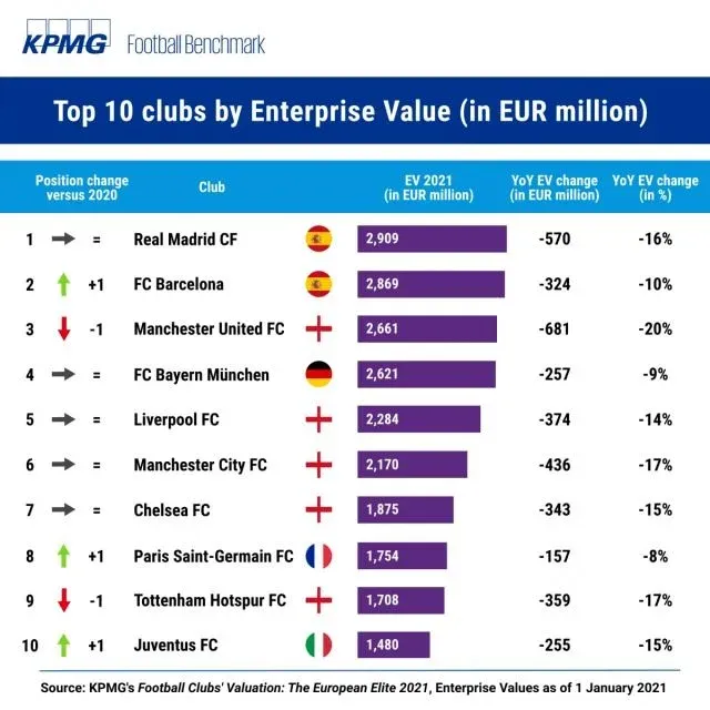 KPMG publicó la sexta edición de su informe anual “Valuaciones de clubes de fútbol: la elite europea 2021”, una herramienta de inteligencia para la industria del deporte más popular del planeta que clasifica a los 32 clubes de fútbol europeo más destacados según su valor empresarial (EV).