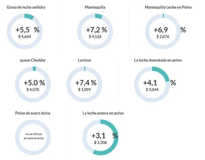 Todos los precios mostraron un aumento: la grasa butírica anhidra se comercializó a un 5,5% más que la última subasta; la manteca a un 7,2% más; el suero de manteca en polvo a 6,9% más y el queso tipo cheddar 5%.