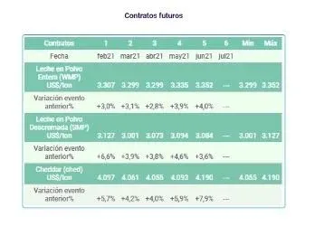 En la primera subasta de 2021 de la plataforma Global Dairy Trade de Fonterra aumentaron todos los precios de los productos lácteos. El índice global de precios mostró un aumento de 3,9% y dejó un promedio por tonelada de US$ 3.420. Esta comercialización es referente para los mercados internacionales, y para los países exportadores de lácteos como Uruguay.