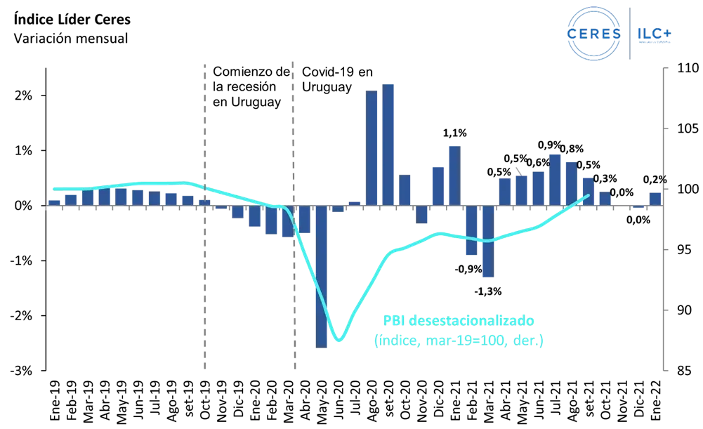 El Índice Líder de CERES (ILC) creció 0,2% en enero tras dos meses de resultado neutro, por lo que el año 2022 comienza con una señal positiva, mejor que el final de 2021, según datos divulgados este viernes.
