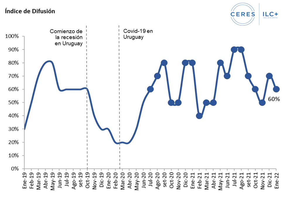 Por su parte, el Índice de Difusión en enero fue 60%, lo que indica que más de la mitad de las variables que componen el ILC registraron tasas positivas en el mes. Este indicador es complementario del Índice Líder y mide la amplitud de la base de sustento de su movimiento mensual, ya que considera la proporción de las variables del ILC con tasas positivas en cada mes.