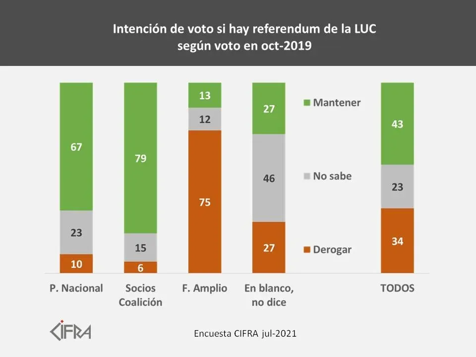 Las posiciones de los votantes respecto a la LUC tienden a alinearse con las de sus partidos: el 75% de los frenteamplistas votaría por derogar, y el 67% de los blancos y el 79% de los otros socios de la coalición de gobierno votarían por mantener. Sin embargo, en todas las filas hay disidentes, pequeñas minorías que votarían distinto a lo que defienden sus líderes, y también indecisos. El grupo más dividido es el de los votantes que no explicitan su voto pasado o votaron en blanco.