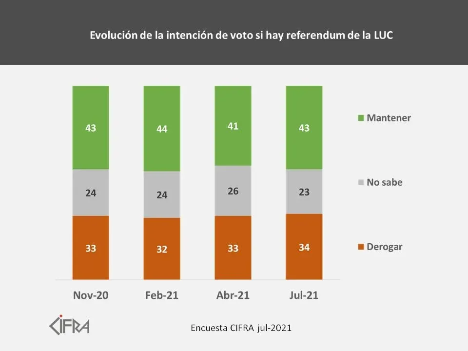 Casi ocho de cada 10 ciudadanos ya tienen posición tomada sobre qué votarían si el referéndum para derogar 135 artículos de la Ley de Urgente Consideración (LUC) se realiza. El 43% de la población votaría para mantener los artículos y el 34% votaría por derogarlos. Aún un 23% no sabe, según una encuesta realizada por Cifra antes de que la Comisión Pro Referéndum presentase las casi 800 mil firmas ante la Corte Electoral.