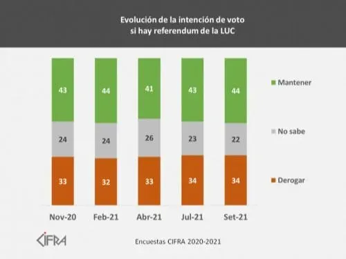 En comparación con informes anteriores de la misma consultora, las posiciones hacia la LUC se mantienen estables. Desde noviembre de 2020 las encuestas registran variaciones pequeñas a lo largo de los meses, y la diferencia entre quienes votarían por derogar y quienes votarían por mantener los artículos se mantiene entre un máximo de 12 puntos –en febrero– y un mínimo de 8 puntos –en abril–. Y siempre se registra cerca de un cuarto del electorado indeciso.