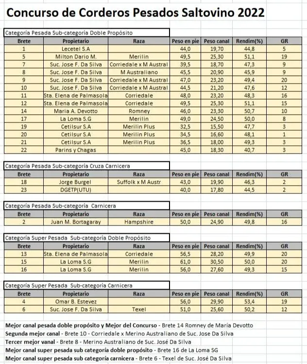 Los corderos pesados salen con 40 a 45 kilos, tras 12 a 14 meses, en promedio. El cordero que ganó el posmortem pesó en vivo 46 kilos, la canal pesó 23,3 kilos, tuvo un rendimiento de 50,7% y en grasa 10%.