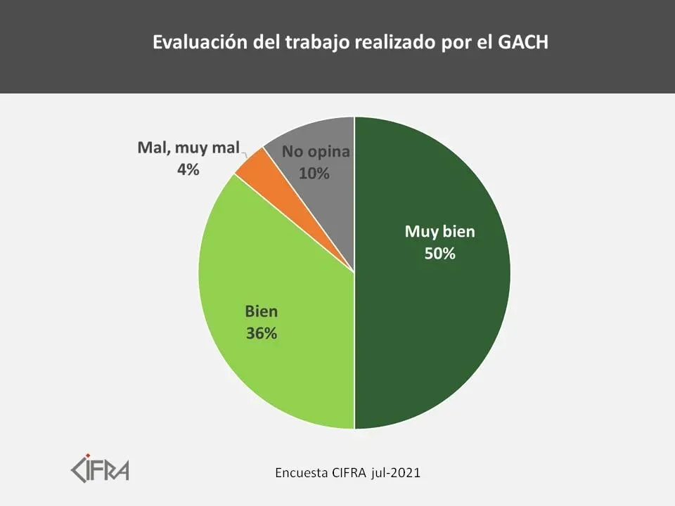 El 50% de los uruguayos considera que el Grupo Asesor Científico Honorario (GACH) hizo un muy buen trabajo a lo largo de los casi 15 meses en que se desempeñó, y otro 36% que hizo un buen trabajo. En conjunto, el 86% tiene una opinión positiva de su actuación y apenas el 4% tiene una opinión crítica. En tanto, un 10% prefirió no opinar.
