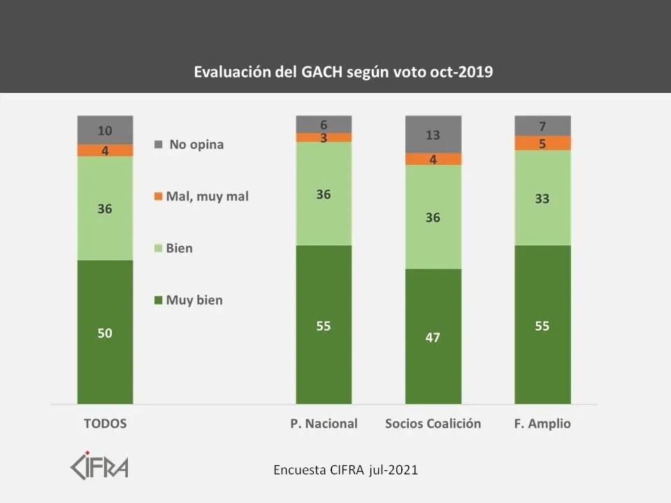 Es así que el grupo de científicos tiene una imagen que trasciende lo políticopartidario, según se desprende de una encuesta que realizó Cifra y que presentó en Telemundo (canal 12) este jueves. En todas las tiendas políticas la amplia mayoría aprueba la actuación del GACH. Los más entusiastas son los votantes del Partido Nacional y también los del Frente Amplio.