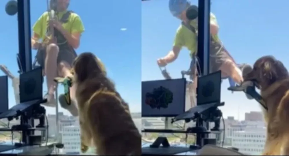 El clip, compartido por el usuario de Facebook @ThePetCollective, ofrece un vistazo a un momento verdaderamente adorable. Un hombre, equipado con arnés, realiza tareas de limpieza en las ventanas de un edificio de varias plantas. Es en este contexto donde nuestro protagonista de cuatro patas entra en escena. El golden retriever, al percatarse de la presencia del limpiavidrios al otro lado del vidrio, despliega sus encantos en un intento de interactuar.