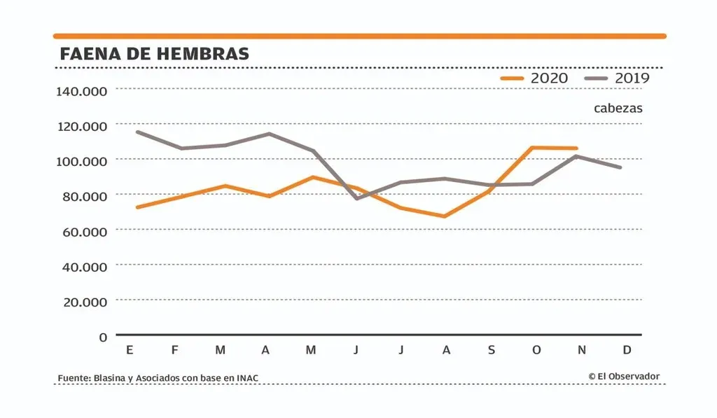 Pero por ahora el ajuste lo hacen los novillos. En este caso, el aumento de la faena es de 28% en noviembre. No aumenta la faena de vaquillonas este mes.