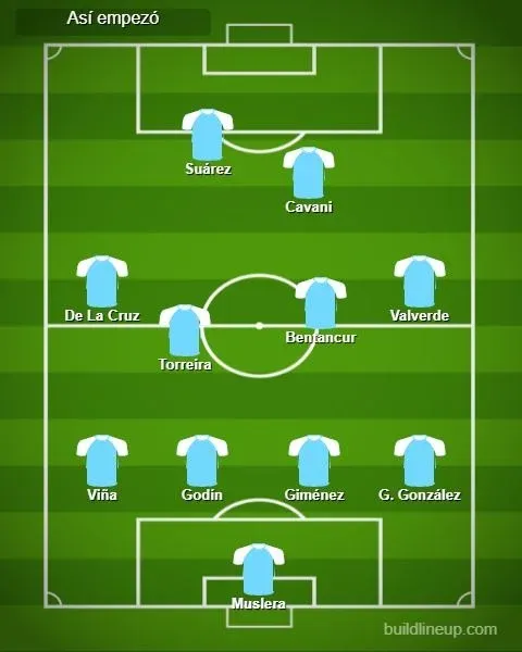 La selección empezó con cuatro cambios respecto al último partido que jugó por las Eliminatorias contra Venezuela. Salió Martín Cáceres del lateral izquierdo y ese lugar fue ocupado por Matías Viña. En la mitad de la cancha ingresaron Rodrigo Bentancur y Nicolás de la Cruz en lugar de Matías Vecino y Facundo Torres, mientras que adelante el regreso de Edinson Cavani –suspendido en las Eliminatorias– desplazó al banco de suplentes a Jonathan Rodríguez.