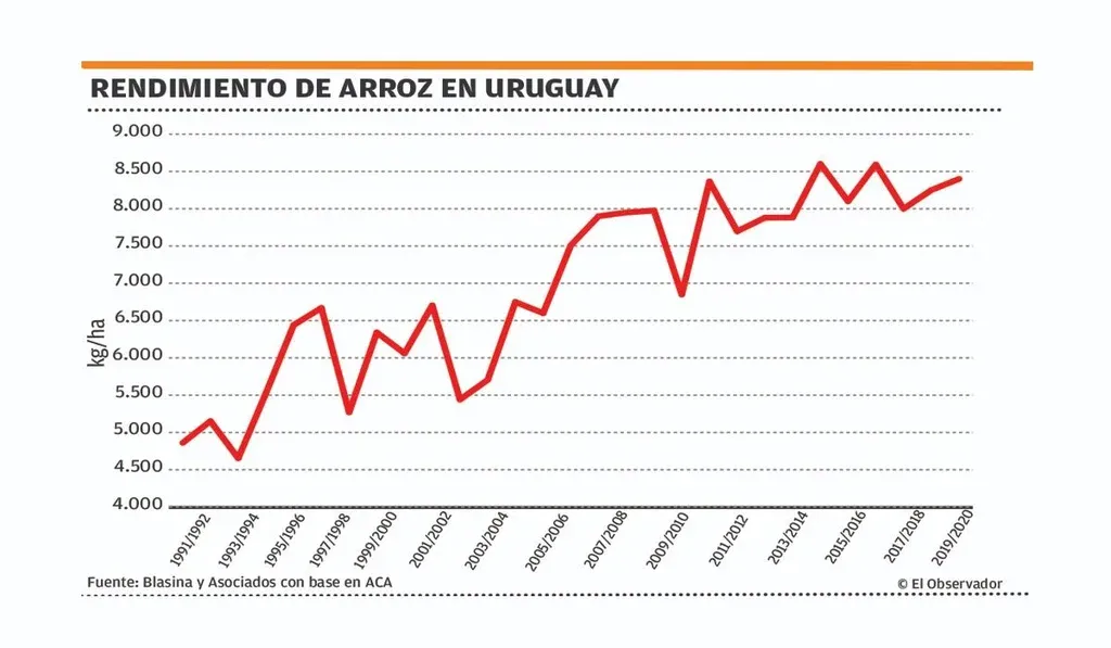 Por lo tanto, para igualar la producción de la zafra pasada sería necesario obtener un rendimiento promedio nacional de 9.200 kg/ha, que no se ha alcanzado en la historia del cultivo en Uruguay.