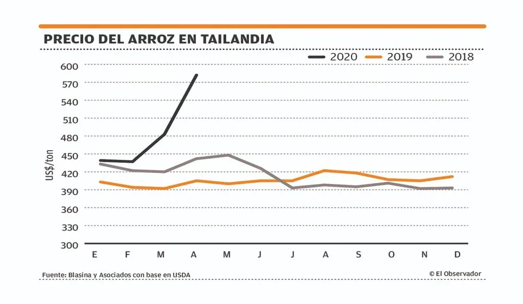 Vietnam –el tercer mayor exportador mundial del cereal desde 2013– suspendió la firma de nuevos contratos de exportación, para garantizar que los suministros nacionales sean suficientes durante la pandemia. El Ministerio de Industria y Comercio solicitó al gobierno esta semana que reanude las exportaciones, pero limite el volumen a 800.000 toneladas para abril y mayo. Una disponibilidad irregular.