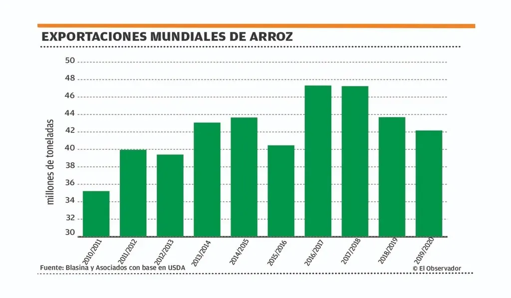 Como consecuencia, el USDA prevé un ajuste de 2% interanual en las exportaciones mundiales de arroz a 42,2 millones de toneladas en 2020, la más baja en cuatro años, es decir 1,5 millones de toneladas exportadas menos que un año atrás y 5 millones menos que lo exportado dos años atrás.