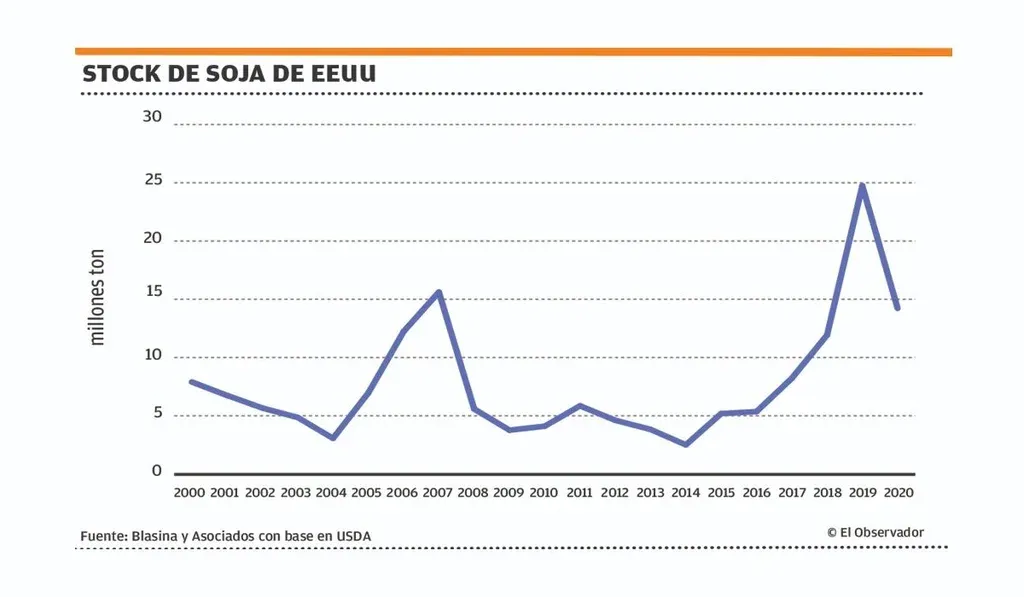 El stock de soja en Estados Unidos a setiembre pasó a 14,23 millones de toneladas desde 24,7 millones un año atrás, 43% menos que un año atrás y 9% por debajo de las 15,68 millones de toneladas esperadas por los analistas privados.
