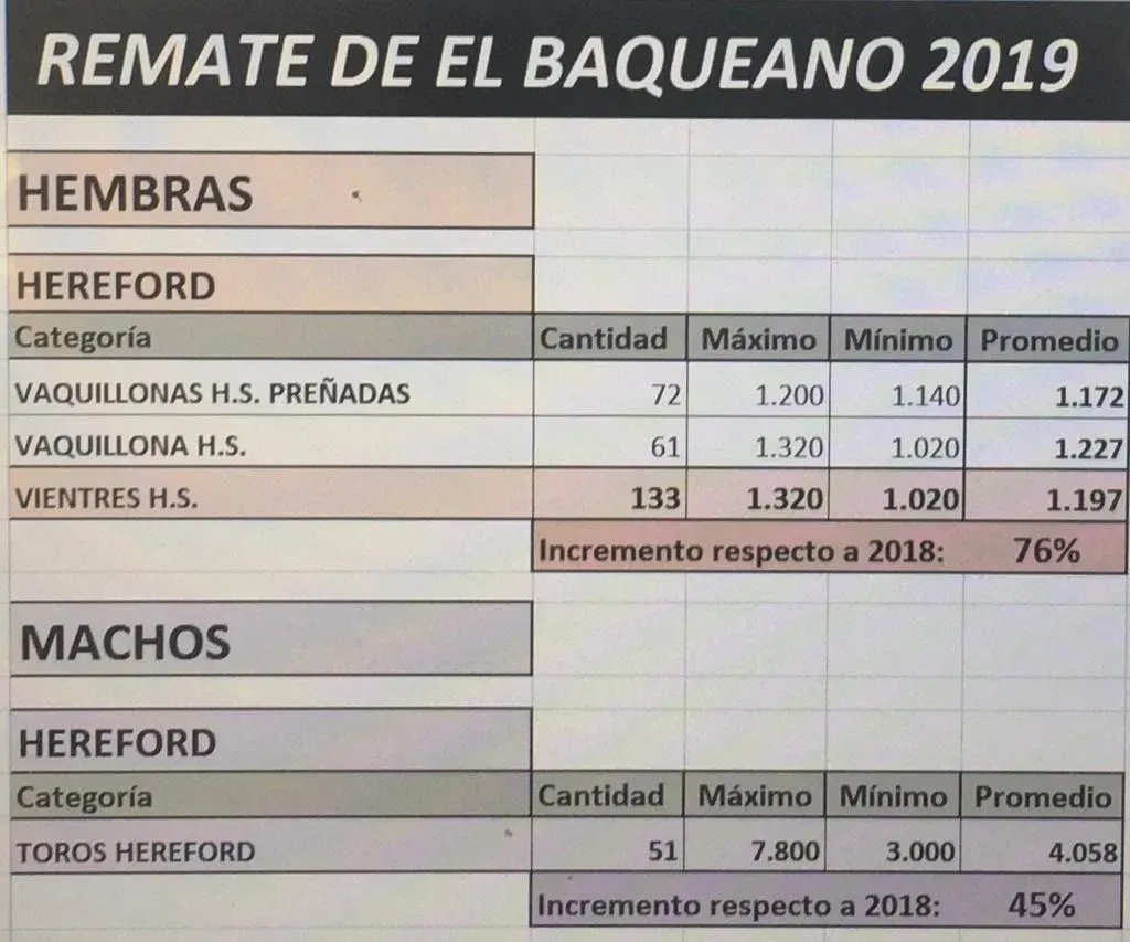 Con negocios a cargo de Zambrano & Cía, la torada Hereford promedió US$ 4.058, un 45% más que en 2018