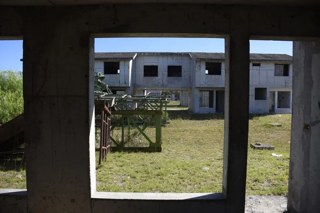 El terreno de Médanos de Solymar pasó como fideicomiso a manos de la ANV. En el amplio predio se erigen hasta hoy las casas a medio construir, con un avance de obra entre 19% y 29%, según apuntó la representante del Frente Amplio en el Directorio del organismo, Verónica Dodera. Al costado de las obras yacen apiladas las estructuras de las grúas y un galpón abandonado con custodia privada.