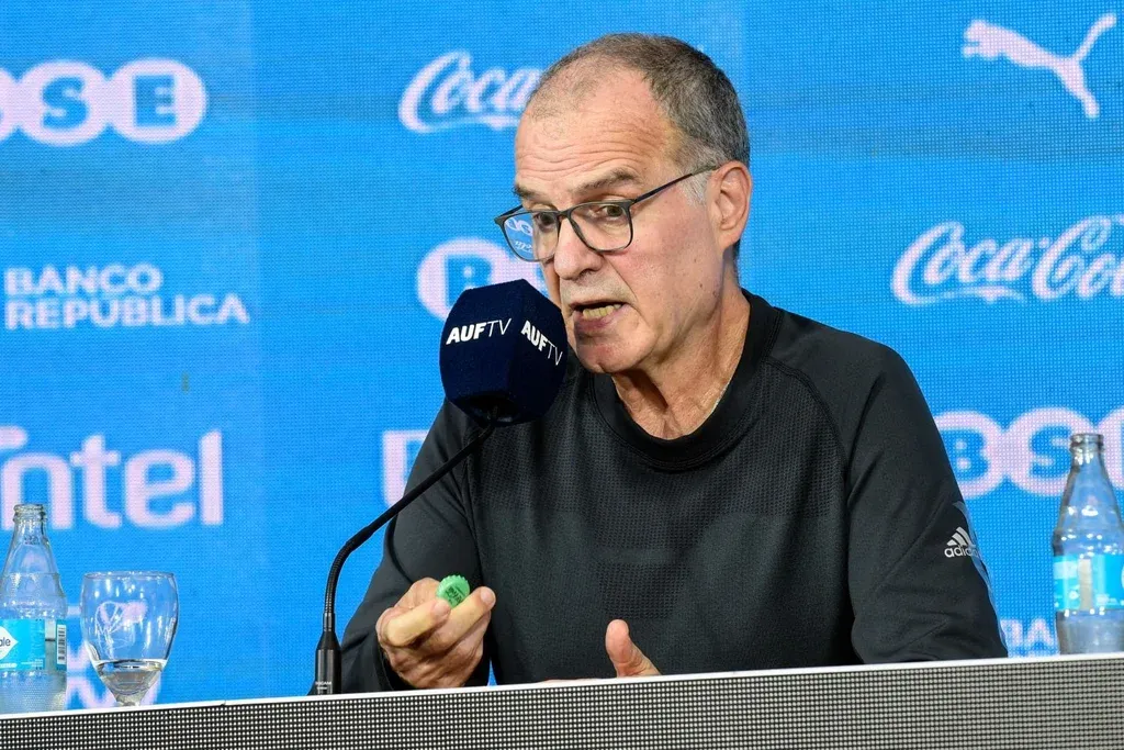 El flamante entrenador de la selección uruguaya de fútbol, el argentino Marcelo Bielsa, fue el involuntario protagonista de un blooper de marcas en el marco de su presentación oficial y conferencia de prensa que se llevó a cabo el pasado el miércoles en el Estadio Centenario.