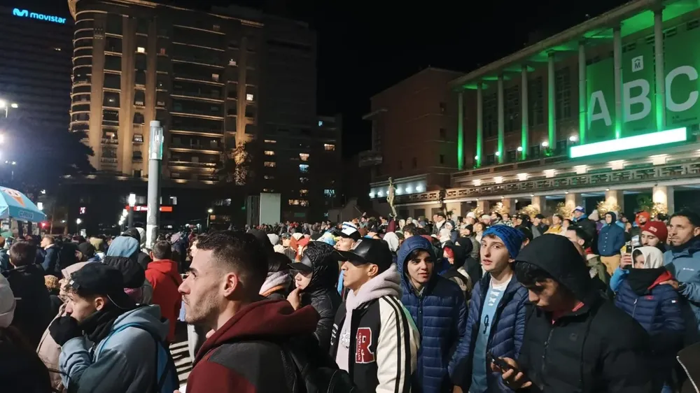 Hay una conexión marcada entre lo que se ve en la tele gigante y lo que hace el público en la Intendencia. Luciano pide aliento al público del Estadio Único de La Plata: la explanada se parte en aplausos. La hinchada en Argentina empieza a cantar, y el ruido alienta a ese público a cientos de kilómetros a hacer lo mismo.