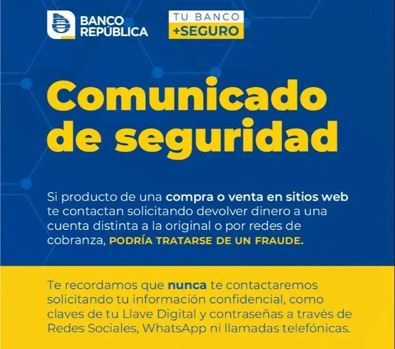 El Banco República advirtió a sus clientes por una nueva modalidad de estafa, "si producto de una compra o venta en sitios web te contactan solicitando devolver dinero a una cuenta distinta a la original o por redes de cobranza, podría tratarse de un fraude", indicaron desde el banco en un comunicado difundido este martes.